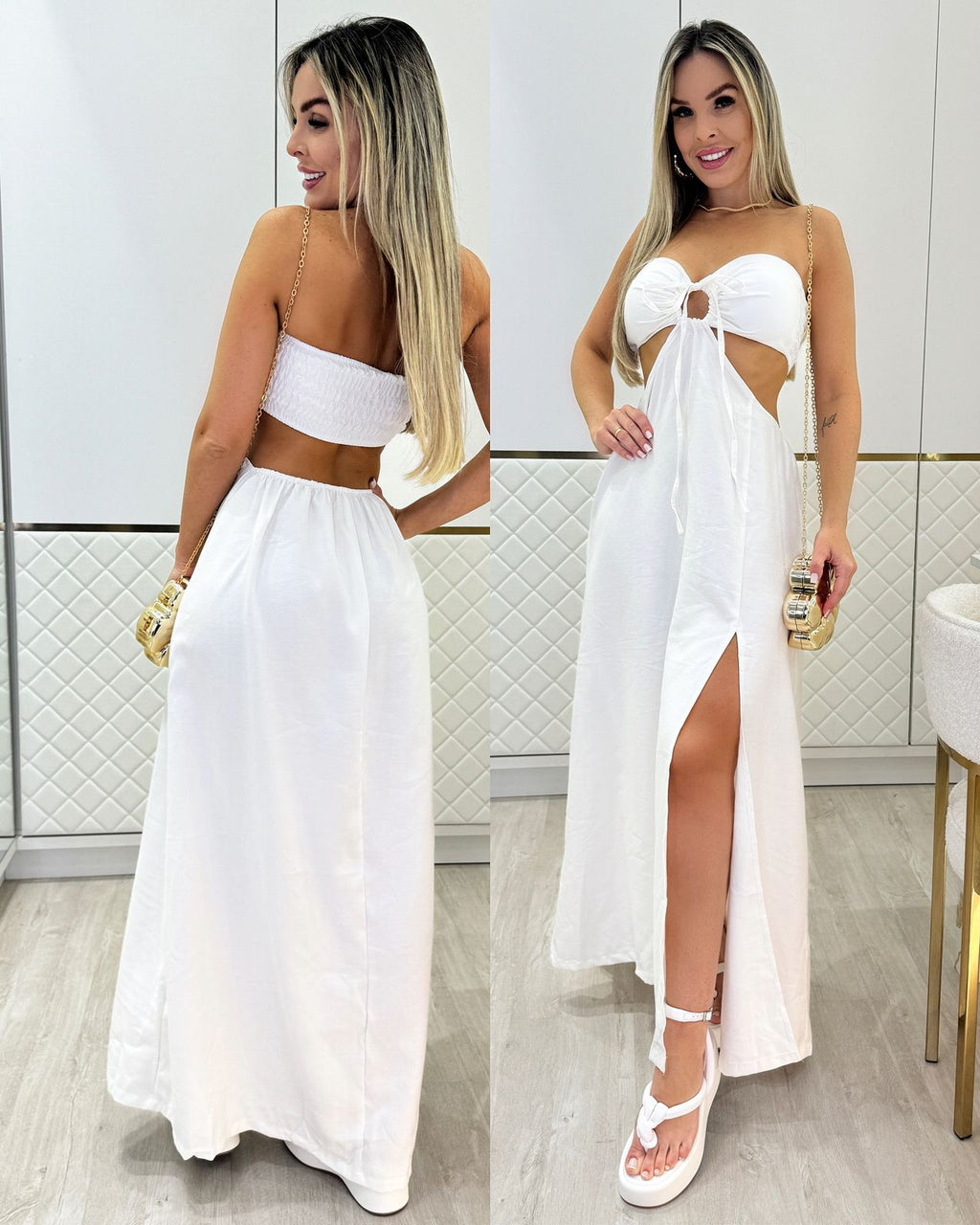 Medidas: busto 58 cm, cintura 70 cm, quadril 108 cm e comprimento 121 cm.